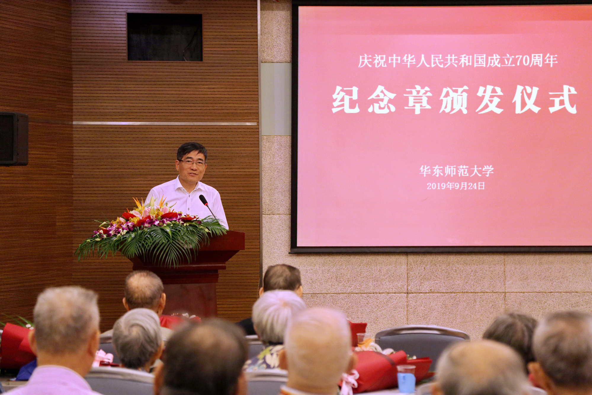 9月24日上午,我校在逸夫楼校长培训中心3楼多功能厅隆重举行“庆祝中华人民共和国成立70周年”纪念章颁发仪式,校党委书记、老龄委主任童世骏,副校长、老龄委副主任梅兵为与会的23位老同志颁发纪念章。我校离退休干部、老教授协会理事及各分会会长、各学部院系退休党支部书记等90余人出席颁章仪式,仪式由副校长梅兵主持。