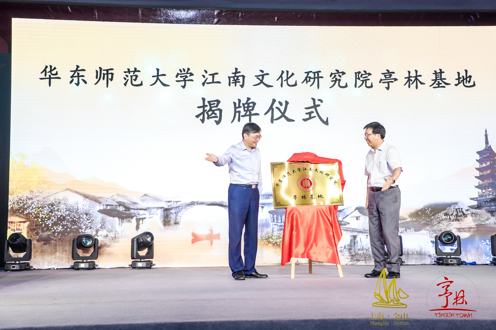钱旭红和赵卫星共同为“华东师范大学江南文化研究院亭林基地”揭牌。基地旨在发挥华东师大江南文化研究院在“江南文化”领域的多学科和跨学科学术研究优势,结合亭林镇深厚的古文化资源和独特的历史人文底蕴,充分挖掘亭林历史文脉,营造浓厚人文氛围,实现人文精神引领有力,传统文化传承有序,乡村文化持续振兴,文化产业活力彰显的目标,产生一批标志性的江南文化研究成果,形成文化搭台、经济唱戏的良好局面,将亭林打造成现代和古朴风格交织的江南文化名镇。人文与社会科学研究院院长吴瑞君参加签约仪式。本次活动还将通过举行亭林古文化展、顾公广场落成典礼、亭林文化展示及顾野王诗词书画展、专题研讨及文脉考察等活动深入推动顾野王及其文化的研究、传承和创新。