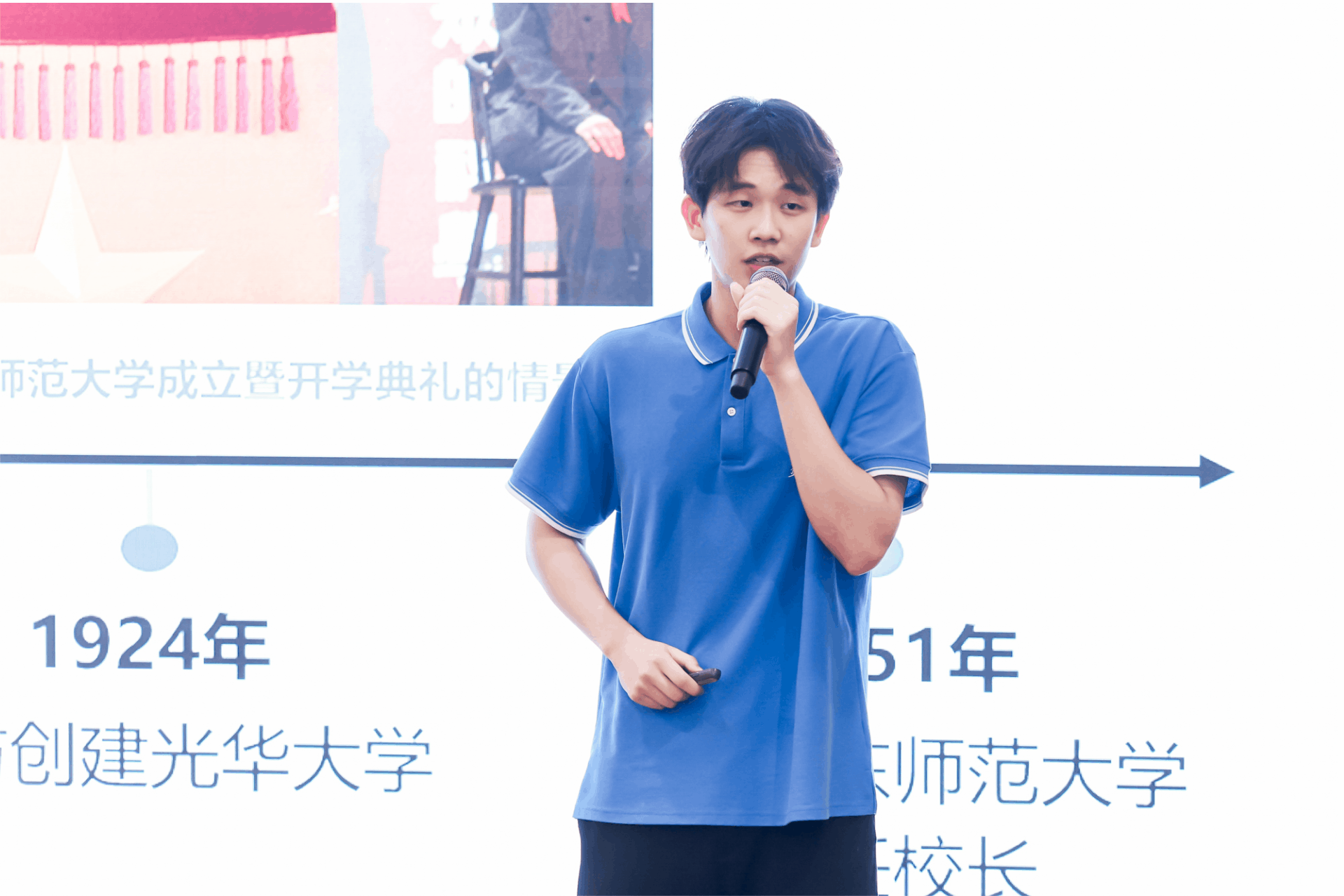 计算机科学与技术学院2023级本科生商婧雯,法学院2025级硕士研究生张浩然,数学科学学院2024级本科生杨颖鹏和梅兵书记一起,共同讲述华东师大前身大夏大学、光华大学、圣约翰大学的办学历程,以及华东师大作为新中国第一所社会主义师范大学的攀高行远之路。刚刚结束在联合国工业发展组织实习的外语学院2023级硕士研究生高婕担任主持人。