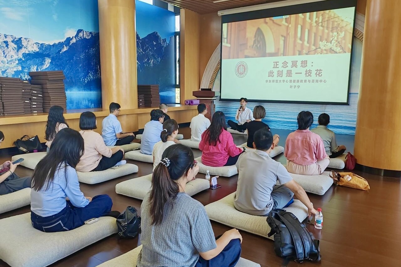 在服务校内师生的同时,华东师大积极拓展心理健康服务的社会辐射范围,将专业服务延伸至社会群体。世界精神卫生日活动期间,学校面向上海市高级政工师开展“正念冥想:此刻是一枝花”工作坊,助力政工师群体在繁忙工作中调节心理状态、舒缓压力。